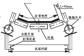 2、安裝跑偏開(kāi)關(guān)應(yīng)選擇輸送裝置易出現(xiàn)跑偏的位置處安裝,參考應(yīng)用單位工藝要求,同時(shí)要考慮皮帶與擋輪的有效間距和推力,建議皮帶與檔輪間的安裝距離為40mm(詳見(jiàn)圖)。