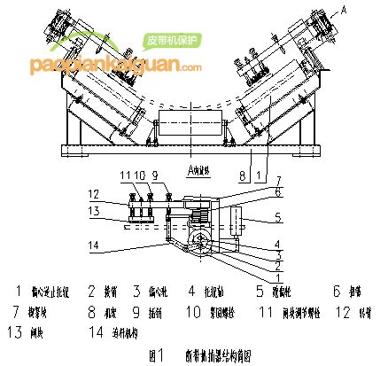 下斷帶保護(hù)裝置(見圖2)主要有逆止托輥2、平行托輥9、偏心逆止托輥6、制動連桿5、撥桿4等組成,偏心逆止托輥內(nèi)裝有偏心輪6、制動輥軸8及偏心輪傳動機(jī)構(gòu),逆止托輥裝有撥銷輪3及傳動機(jī)構(gòu)。