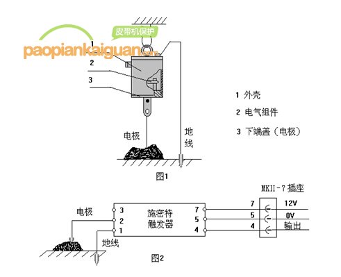 參照圖1和圖2,將KGU3B型堆煤開關吊掛在檢測物料點的上方,用帶MKⅡ-7插頭的電纜插到PROMOS系統(tǒng)的輸入口,用金屬桿或鏈吊掛在電極上,自然下垂,長短按檢測要求調節(jié),再用一個導線將外殼接地(接到檢測物料的下方,并接觸良好)即可,對煤和水不需調節(jié)。